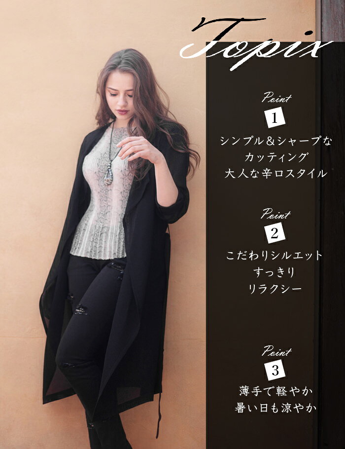 シャープな縦長ラインで大人な辛口スタイル ・サッと前を開けてはおったり、ウエストをベルトで絞めて異なる表情が楽しめます ・上品な透け感のある薄手で軽やかな生地仕立て、暑い日も 涼やかな着心地です ・キレイめなスタイルからカジュアルまであらゆるテイストのコーディネートにマッチ ・メッシュ生地 ・ノーカラー×ドレープ襟仕様 ・長袖 ・両サイドにポケット有 ・共布ベルト付 170×5cm ・裏地無 ・ロング (インナー、ボトムス、アクセサリー等は別売りとなっております) ※動画サイズ 797.23 KB ご注意ください! ※タイトル又は商品説明に記載のない衣類、小物などは付属しておりません ※お使いのモニター環境等によって素材感や色の見え方に違いがある場合がございます-Coordinate Item- ・着用のブラウスはこちら>> ・着用のパンツはこちら>> ・着用のワンピースはこちら>> ・着用のベルトはこちら>> -Coordinate Item- ・着用のチュニックはこちら>>